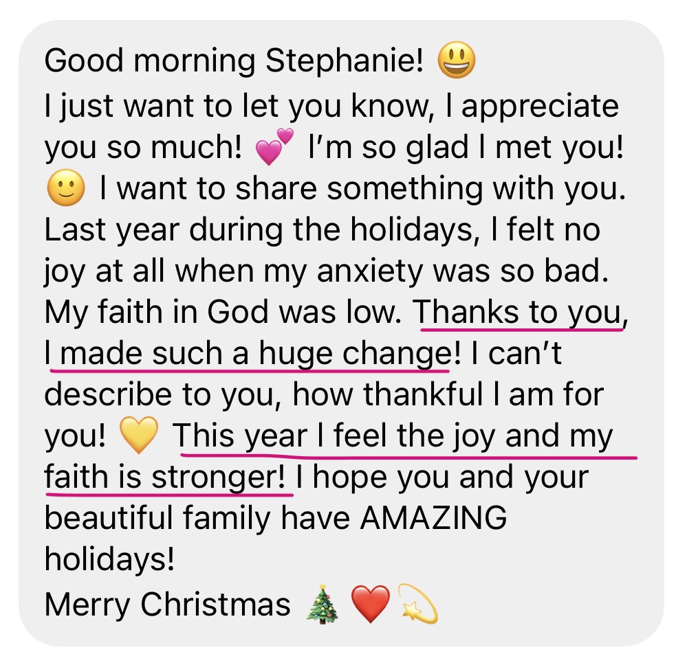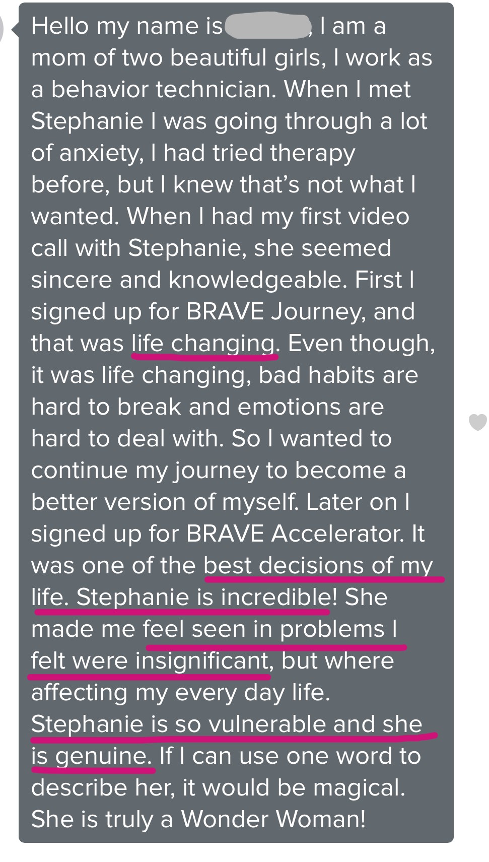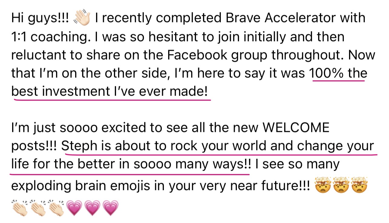 When l met Stephanie l was going through a lot of anxiety, l had tried therapy before, but l knew that’s not what l wanted. When l had my first video call with Stephanie, she seemed sincere and knowledgeable. First l signed up for BRAVE Accelerator, and that was life changing. Even though, it was life changing, bad habits are hard to break and emotions are hard to deal with. So l wanted to continue my journey to become a better version of myself. Later on l signed up for BRAVE Journey. It was one of the best decisions of my life. Now I feel more confident in myself. I feel like while working together l discovered my value. Before l it used to really bother me, when l wouldn’t get something done, like organize a pile of clothes. Now l focus on the things l do get done during the day. Stephanie is incredible! She made me feel seen in problems l felt were insignificant, but where affecting my every day life. Stephanie is so vulnerable and she is genuine. If l can use one word to describe her, it would be magical. She is truly a Wonder Woman!