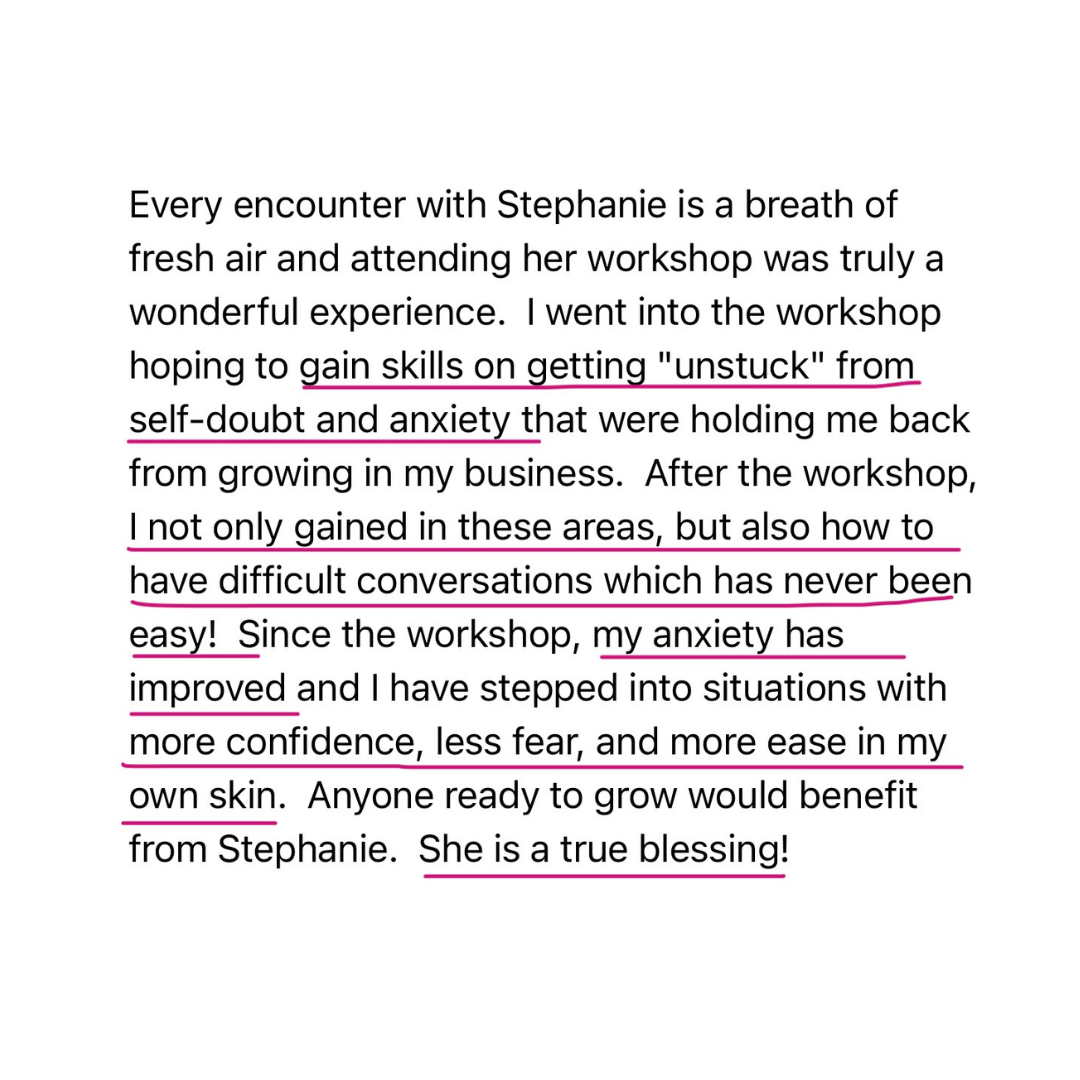 Prior to taking Stephanie's course, I felt overwhelmed and out of touch with the positive qualities I knew existed inside me, but were lost in my new role as a mother (during a pandemic). Stephanie's course helped me gain the confidence that was missing and helped me tune into my own inner voice and learn the skills to tune out the noise.
