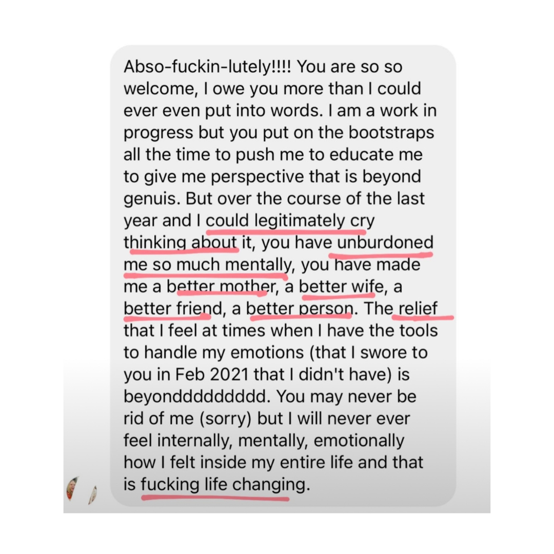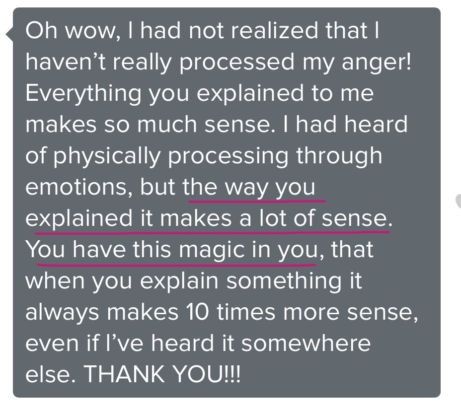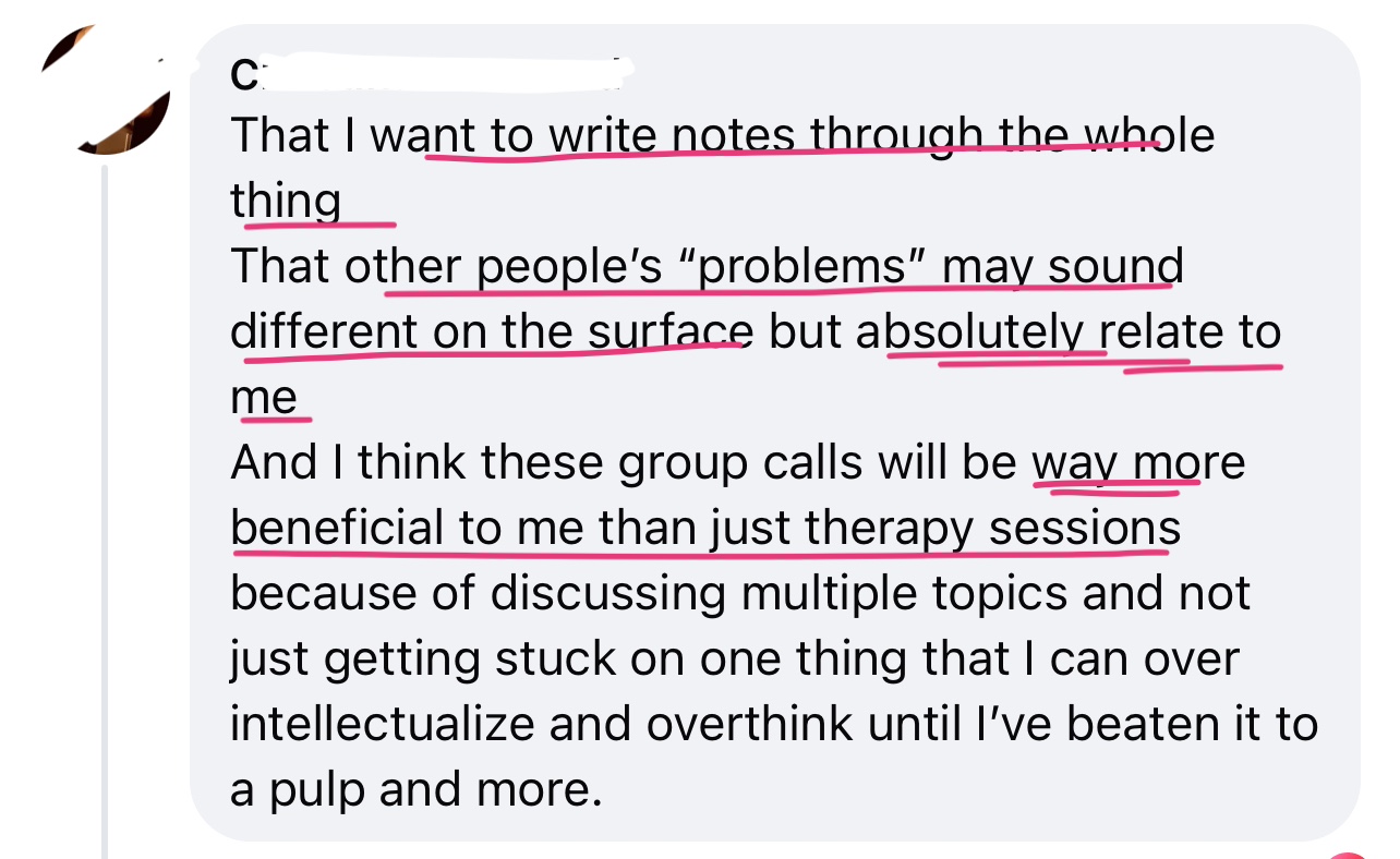 I’d think that I was done figuring myself out and I’d learn something new. If you find yourself feeling stuck or having trouble navigating relationships, this program will help you immensely. Not only do you gain knowledge, you gain a community and a supportive coach.