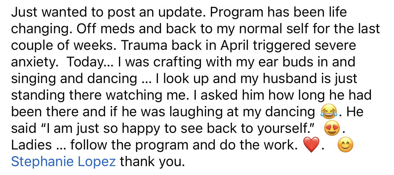 I was struggling with anxiety, low self-esteem, grief, and depression. I feel more confident, better about myself, and now I trust myself. Wow, this has been a game-changer!